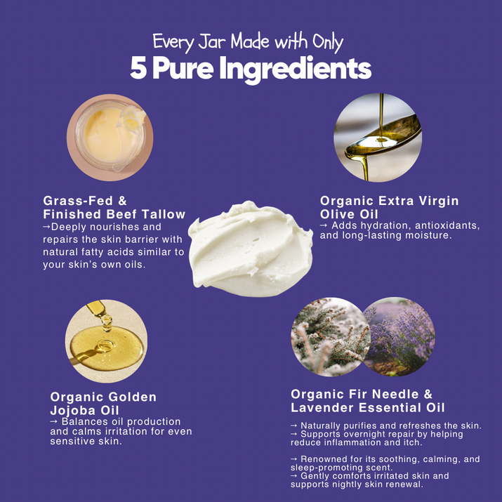 Ingredients: Grass Fed & Finished Beef Tallow, Organic Extra Virgin Olive Oil, Organic Golden Jojoba Oil, Organic Fir Needle Essential Oil, Organic Lavender Essential Oil